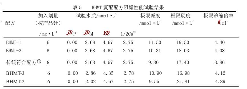 使用的有機(jī)膦類阻垢劑(ATMPHEDP) 、羧基磷酸阻垢劑(PBTCA) 、聚合物分散劑、共聚物分散劑中的一種或多種阻垢劑。3 個(gè)符合配方(以下簡(jiǎn)稱 BHMT-1,BHMT-2,BHMT-3)的 BHMT-1 BHMT含量較高, 約為 50% (質(zhì)量百分比, 下同) ; BHMT-2、 BHMT-3 BHMT 含量較低, 為 20%30%; BHMT-1,BHMT-2,BHMT-3 中其它阻垢劑共 20%50%;BHMT-1BHMT-2、BHMT-3 固體含量相同,均約為 35%。試驗(yàn)用水仍取自所選的 2 個(gè)火電廠,但由于季節(jié)影響,同一水源水質(zhì)較表 3、表 4 有所變化。試驗(yàn)結(jié)見(jiàn)表5