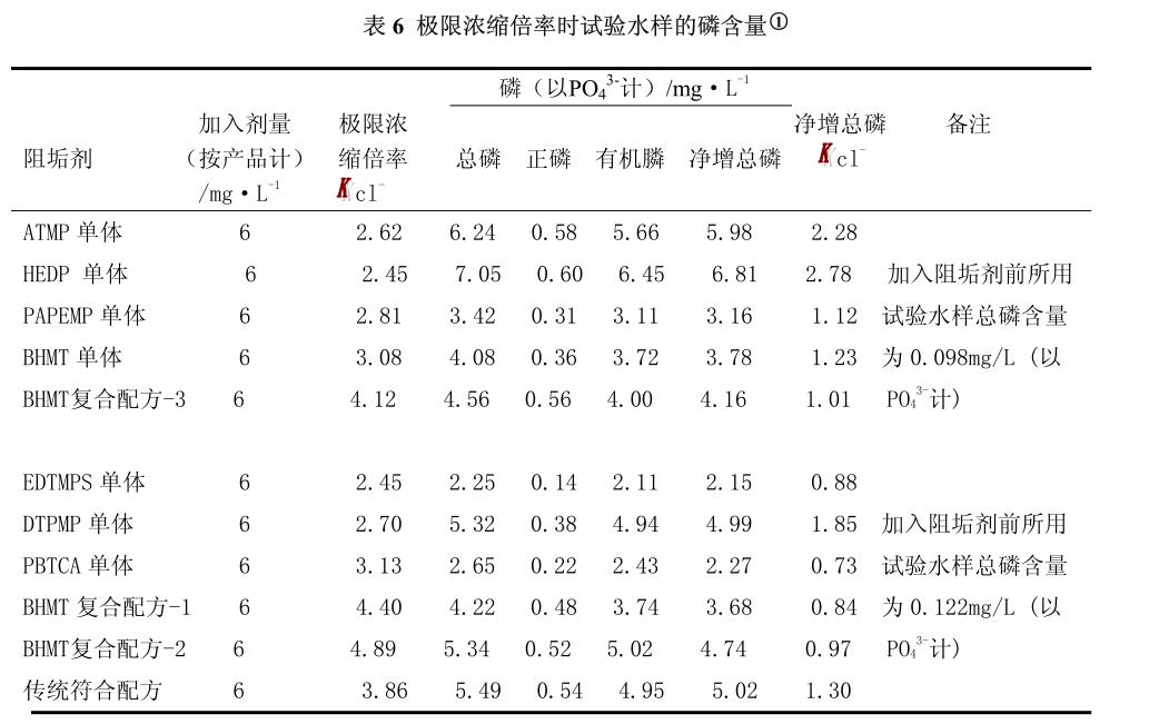 1.23mg/L(以PO 43- 計(jì)) ,與低磷阻垢劑PAPEMP相當(dāng),約為傳統(tǒng)有機(jī)膦阻垢劑ATMP、HEDP 50%。復(fù)配配方中采用BHMT,濃縮倍率每提高 1.0 磷含量增加值較傳統(tǒng)有機(jī)膦復(fù)配配方降低 30%50%。